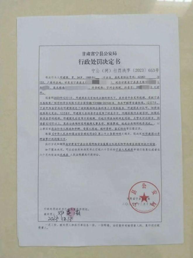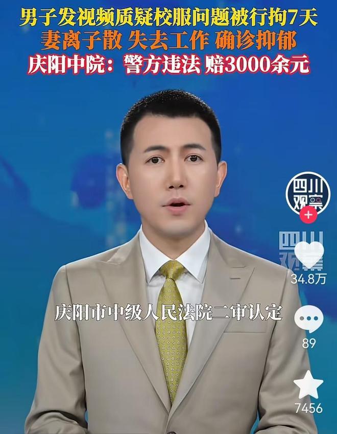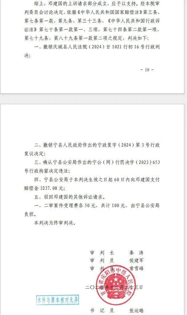 2024 年 10 月,庆阳市中院判决:宁县公安局行政拘留程序违法,赔偿邓建军 3237.08 元 —— 包括 7 天的误工费 1737.08 元和精神损害抚慰金 1500 元。